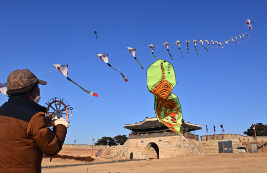 18일 경기 수원시 팔달구 수원화성 창룡문에서 한국연연맹 회원들이 호랑이 연을 날리고 있다.