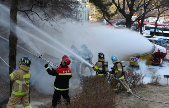 19일 부산 동래구 동래사적공원 일대에서 동래구청과 동래소방서 관계자들이 도시형 산불에 대비해 진화훈련을 하고 있다. 부산은 지난달 18일부터 이날까지 32일째 건조특보가 발효 중이다.