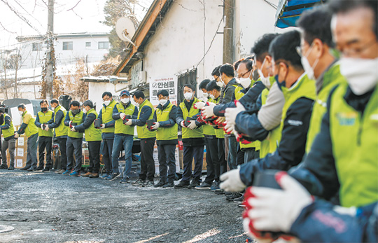 농협중앙회 임직원들이 20일 서울 성북구 정릉동 일대에서 에너지 취약계층에게 연탄을 전달하고 있다.
