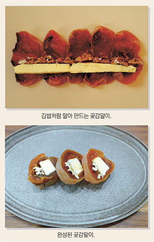 우리나라에서 호두를 넣어 말아 만드는 곶감쌈은 술안주나 주전부리로 집에서 만들어 먹던 간식입니다. 혼례에도 곶감을 이용해 음식을 만들기도 했습니다. 곶감쌈에서 발전된 메뉴로 속에 호두와 크림치즈 또는 버터를 넣어 말아 먹는 요즘 트렌드는 일본의 차과자에서 모티브를 얻어 발전됐습니다. ‘곶감말이’라고 부르는 이 디저트를 쌉싸름한 말차를 격불(擊拂·말차를 마시기 위해 차선을 빠르게 움직여 거품을 내는 행위)해 함께 즐기던 기억이 떠올라 한번 직접 만들어 봤습니다.