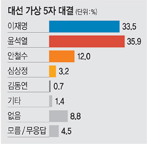 문화일보가 엠브레인퍼블릭에 의뢰해 지난 24∼25일 전국 만 18세 이상 남녀 1001명을 대상으로 진행한 여론조사 가상 5자 대결에서 윤 후보와 이 후보가 선두권을 형성했고, 안 후보가 뒤를 이었다. 심상정 정의당 후보 3.2%, 김동연 새로운물결 후보 0.7%, 기타 후보 1.4%였다. 지난해 12월 조사(12월 26∼27일)와 비교하면 윤 후보는 18∼29세와 서울 등에서 지지율이 크게 오르며 6.6%포인트 상승했고, 이 후보는 1.5%포인트 하락했다. 안 후보는 5%포인트 올랐다. 정권 교체론과 정권 유지론의 차이는 10%포인트 넘게 더 확대됐다. 지난 조사에서는 정권 교체론 49.2%, 정권유지론 39.8%였다.