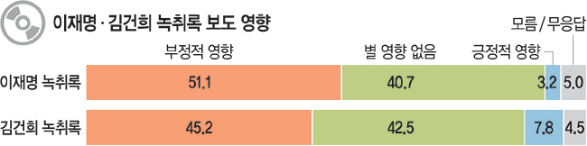 이에 반해 이 후보 지지층은 ‘부정적 영향을 미칠 것’이란 응답이 76.3%이었다. 중도층에선 김 씨 녹취록 보도가 ‘별 영향이 없을 것’이란 응답이 46.9%로 가장 높았고, 이 후보 녹취록 공개에 대해선 ‘부정적 영향을 미칠 것’이라고 답한 유권자는 과반인 52.8%였다.