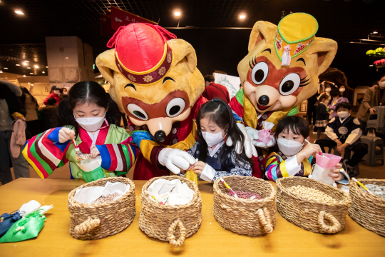 26일 서울 송파구 롯데월드 어드벤처에서 열린 설맞이 ‘드림티켓’ 행사에 초청된 다문화 가정 어린이들이 설빔을 입고 복주머니 만들기 체험을 하고 있다.