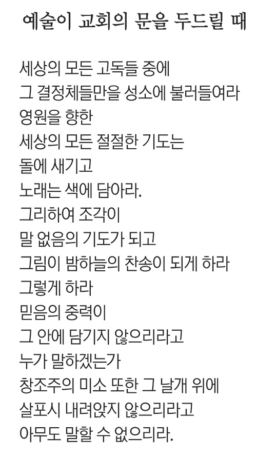세상의 시계는 이미 오래전부터 똑딱, 똑딱… “문화가 답이다”라고 말하고 있었지만 유독 교회만은 빗장을 가로지르고 있었고 그 결과로 예술과 영성이 만날 수 있다고 기대했던 잠재적 신자들을 소외시켜 버렸다. 죄악이고 말고다. 주지하다시피 하나님은 아름다움의 근원이자 우주를 디자인하신 대예술가다. 그 빛을 받은 지상의 예술가 또한 영성과 조화된 창의력으로 영원에 대한 갈망을 가질 때 그가 다다른 결국은 창조주의 발꿈치일 수 있다.