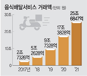 9일 통계청의 ‘온라인쇼핑 동향’(2021년 12월 및 연간)에 따르면, 지난해 온라인 음식서비스(배달음식) 거래액은 25조6847억 원으로 1년 전보다 48.2% 증가했다. 이 중 모바일을 통한 거래액은 24조9882억 원에 달했다. 배달 앱을 통한 주문이 폭발적으로 증가했다는 의미다. 지난해 12월 온라인 음식서비스 거래액은 2조4505억 원으로 1년 전 같은 기간과 비교해 13.3% 증가했다.