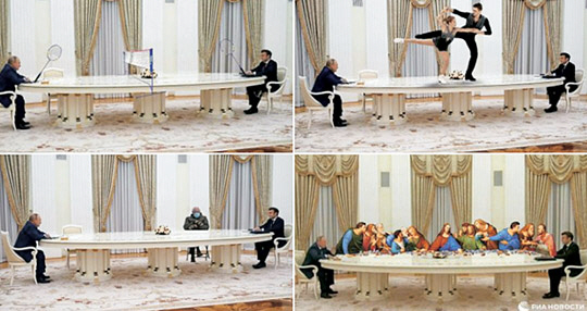 한편 모스크바에서 이뤄진 러·프 정상회담에서 푸틴 대통령과 마크롱 대통령 간 사이에 놓인 5m 길이의 거대한 테이블이 여러 패러디물(사진)을 양산하며 이슈가 되고 있다. 둘만 앉는 자리에서 너무 과한 크기의 테이블이라는 지적이다.