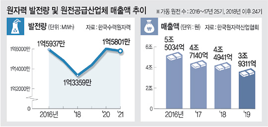 한국원자력산업협회에 따르면 2019년 국내 원전 부품 공급업체 매출은 3조9311억 원으로 탈원전이 시작되기 전인 2016년(5조5034억 원)보다 28.5% 줄었다.