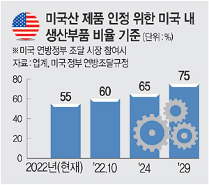 이에 따라 오는 10월 25일부터 미국 연방정부 조달시장에 참여할 때 미국산 제품으로 인정받기 위해선 미국에서 생산된 부품의 비율이 전체 부품의 60% 이상을 차지해야 한다. 미국 정부는 6일(현지시간) 이런 내용을 담은 연방조달규정(Federal Acquisition Regulation) 개정내용을 3월 7일 자 관보에 발표했다. 개정 규정을 보면 미국산 제품으로 인정받기 위한 미국 내 생산부품 비율 기준은 오는 2024년엔 65%, 2029년에는 75%로 단계적으로 강화된다.
