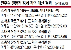 대전 유성구도 비슷한 사례다. 카이스트 본원과 각종 과학단체가 있어 20∼40대 유권자 비율이 상대적으로 높다. 조승래(유성갑)·이상민(유성을) 의원 등 지역구 현역 의원도 모두 민주당 소속이다. 하지만 유성구에서 이 후보는 10만8701표(47.50%)를 얻어 11만1342표(48.66%)를 얻은 윤 당선인에게 2641표 차이로 패했다. 민주당 관계자는 “수원 영통구와 대전 유성구 모두 2030남성 비율이 높은 지역”이라며 “이들이 전국적인 흐름에 따라 윤 당선인으로 결집했다고 본다”고 설명했다.