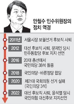 관건은 그가 지금과 다른 정치적 리더십을 선보일 수 있느냐다. 국민의당을 이끌며 1인이 모든 의사결정을 하는 ‘안철수 사(私)당’이라는 비판을 들어왔던 그다. 안 위원장이 국민의힘과 국민의당 합당 대표가 돼서 더불어민주당과의 협치를 이끌어낸다면 다음 대선에서 유력 대권 주자로 부상할 수 있다. 그러기 위해서는 우선 인수위를 성공적으로 이끌어야 한다. 실패했다는 평가를 받은 ‘박근혜 인수위’ ‘이명박 인수위’의 전철을 밟지 않으려면 철저한 인사 검증도 필수적이다. 인수위의 성패로 안 위원장의 정치적 명운이 좌우될 것이란 시각이 강하다.