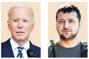 볼로디미르 젤렌스키(오른쪽) 우크라이나 대통령도 16일 미 의회에서 화상 연설을 한다. 하지만 러시아의 우크라이나 수도 키이우(키예프) 공습이 거세지며 시가전이 임박했다는 관측이 제기되고, 유엔이 러시아의 핵무기 사용 가능성을 우려하는 등 사태 해결은 요원한 상태다.