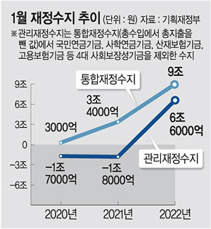 올해 1월 통합재정수지는 9조 원 흑자를 기록했다. 통합재정수지에서 국민연금 등 4대 사회 보장성 기금을 제외해 실질적인 나라 살림살이 형편을 보여주는 관리재정수지도 6조6000억 원 흑자를 나타냈다. 기재부 관계자는 “통상 1월은 지출 대비 수입이 많아 흑자를 기록한다”며 “이연 세수 등으로 흑자 규모가 커진 점을 고려하면 예년 수준”이라고 설명했다.