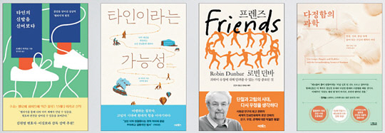 ‘자존감 수업’(심플라이프) 등이 남들의 시선에서 벗어나 ‘내 삶’을 주체적으로 꾸리는 방법에 초점을 맞췄다면, 최근엔 ‘타인이라는 가능성’(어크로스), ‘타인의 신발을 신어보다’(은행나무), ‘프렌즈’(어크로스), ‘다정함의 과학’(더퀘스트)처럼 공감·타인·우정·연대를 키워드로 내세운 책들이 쏟아지고 있다.