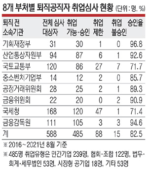 지난 5년간 기획재정부를 비롯한 8개 부처의 퇴직공직자 취업심사에서 불승인을 받은 사람은 10명 중 2명에도 미치지 못해 취업심사제도가 ‘유명무실’ 논란을 불러일으키고 있다. 공직자들이 퇴직 후 가장 많이 진출한 곳은 민간기업과 협회·조합순인 것으로 나타났다.