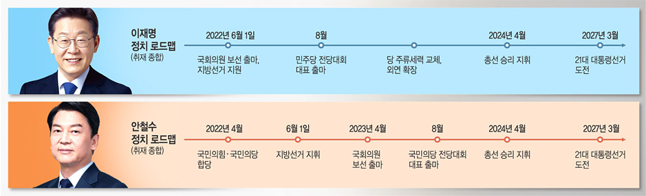 약 한 달 전 대통령선거에서 변방의 투사 이재명은 중앙의 평정을 꿈꿨고, 소수파 수장 안철수는 메이저 무대에서의 반전을 도모했다. 비주류 출신 두 사람은 다시금 중원의 장악을 노린다. 이들은 ‘여의도 입성-당 중앙 장악-세력 확장’을 기획한다는 점에서 향후 ‘싱크로율 99%’의 정치 행보를 보인다. 탄착점은 2027년 대선이다. 둘은 왜, 그리고 어떻게 중앙무대로 직진할까.