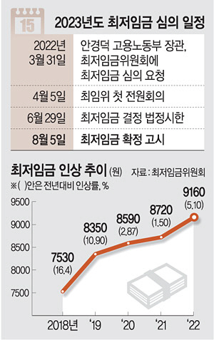 노사는 이미 장외 공방전을 통해 인상률과 차등적용 등 핵심 쟁점을 두고 대립각을 세웠다. 경영계는 현 정부 들어 최저임금이 많이 올랐고, 코로나19 사태로 중소기업과 자영업자의 임금지불 능력이 약해졌다면서 인상에 반대하고 있다. 최근 탄력받은 업종별 차등 적용 등 제도 개편도 강하게 밀어붙이고 있다. 반면 노동계는 물가 상승 폭이 크다는 점을 앞세워 최저임금을 인상해야 한다고 주장하고 있다.