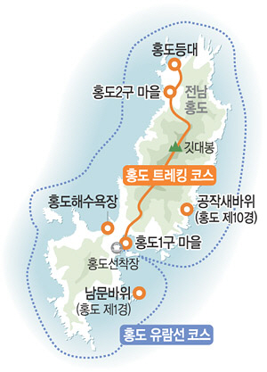 홍도 관광은 예나 지금이나 수동적이다. 유람선이 데려다주는 대로, 가이드가 설명하는 대로 섬을 보게 되니 그렇다. 그렇지만 홍도를 능동적으로 보는 방법도 있다. 다름 아닌 ‘섬 트레킹’이다. 홍도의 트레킹 코스는 홍도 남쪽의 홍도 1구 마을에서 고치산 능선을 타고 산 정상 깃대봉(367m)을 넘어 섬 북쪽 홍도 2구 석기미 마을까지 이어지는 4㎞ 남짓의 산길이다. 이 길을 걷기 시작하자 비로소 섬 안에 있다는 생각이 들었다. 유람선에서 가이드 안내로 보는 홍도가 차 창밖을 내다보는 느낌이었다면, 트레킹 코스 위에서 홍도는 훨씬 더 가깝게 느껴졌다.