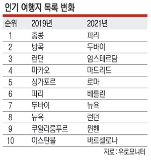 이는 아시아 도시들이 상위권을 차지했던 2019년과 확연히 달라진 것이다. 2019년 인기 여행도시 1위를 차지했던 홍콩은 이번에 20위권 밖으로 밀려났고, 방콕·마카오·싱가포르 등도 마찬가지로 순위가 급하락했다. 이번에 20위권에 든 아시아 도시로는 일본 도쿄(東京)가 15위로 유일하다. 이는 아직 코로나19 팬데믹과 이에 대한 규제가 진행 중인 아시아 도시들에 비해 유럽 도시들은 규제를 앞서 해제했고 빠르게 관광 인프라 등을 재정비하고 나섰기 때문으로 보인다.
