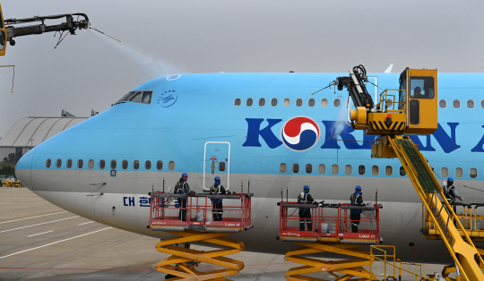 코로나19 거리두기 제한이 풀리면서 여행 수요가 급증하는 가운데 18일 오전 인천 중구 운서동 대한항공 인천 정비 격납고에서 정비 직원들이 항공기 동체 세척 작업을 하고 있다.