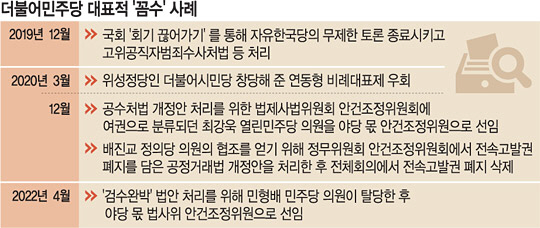 민주당은 ‘살라미 전술’ ‘야당 몫 안건조정위원에 우군(友軍) 넣기’를 통해 2012년 국회 선진화법 도입 당시 마련된 야당의 입법 저지 수단을 무력화하는 등 국회와 선거제도를 능멸하는 ‘꼼수’를 계속 사용해 왔다. 2019년 12월 고위공직자범죄수사처법 제정안, 준 연동형 비례대표제 도입을 위한 공직선거법 개정안 등을 처리하는 과정에서 회기 끊어 가기를 통해 자유한국당의 무제한 토론을 강제 종료시켰다. 준 연동형 비례대표제 도입에 반대한 미래통합당이 위성정당을 창당하자 민주당도 더불어시민당을 만들어 대응했다. 자신들이 도입한 제도를 시행도 하지 않고 부정한 셈이다. 21대 국회의원 총선거에서 대승을 한 후에는 대화와 타협을 통해 합의를 도출하자는 취지에서 도입된 안건조정위를 입법 독주의 도구로 변질시켰다. 2020년 12월 공수처법 개정안 처리를 위한 법사위 안건조정위에 여권인 최강욱 열린민주당 의원을 야당 몫 조정위원으로 선임하는 등 비교섭단체 의원, 무소속 의원 등을 동원해 야당의 반대를 돌파했다.