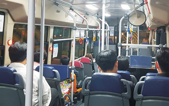 버스 안은 크게 붐비지 않았지만 시간이 지날수록 버스 빈자리가 채워졌다. 버스가 젊은이들의 ‘핫플’ 강남역에 도착하자, 10명의 2030 승객이 우르르 올라탔다. 탑승객들은 술자리의 여운이 가시지 않은 듯 곳곳에서 대화를 나눴다.