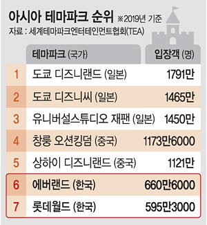 21일 세계테마파크엔터테인먼트협회(TEA) 등이 코로나19 이전 통계를 기준으로 발표한 ‘2019년 세계 놀이·테마파크 입장객 순위 톱 25’에 따르면 일본은 도쿄 디즈니랜드(3위)와 도쿄 디즈니씨(4위), 유니버설스튜디오 재팬(5위), 나가시마 스파랜드(18위) 등 4개 테마파크를 올려놓았다. 후발 주자인 중국 역시 창룽 오션킹덤(8위), 상하이 디즈니랜드(10위) 등 4곳이 포함됐다.