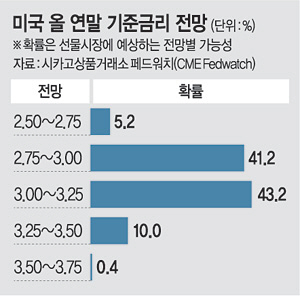 9일 한국은행과 금융업계 등에 따르면 미 연방준비제도(Fed)는 이달 기준금리 결정에서 ‘빅스텝’(0.50%포인트 인상)을 밟은 데 이어 앞으로도 수차례 빅스텝을 밟겠다는 방침을 예고한 상황이다. 이를 두고 시카고상품거래소(CME)그룹 페드워치는 올 연말 미국의 기준금리가 3.00∼3.25%까지 오를 확률을 43.2%로 가장 높게 전망했다. 2.75∼3.00%를 전망하는 시장 참가자들도 41.2%로 집계됐다. 현재 1.50%인 우리의 기준금리를 크게 웃도는 수준으로, 가계부채 문제 등으로 지속적인 기준금리 인상이 어려운 한국 경제 상황을 고려하면 기준금리 역전은 불가피하다는 분석이 많다.