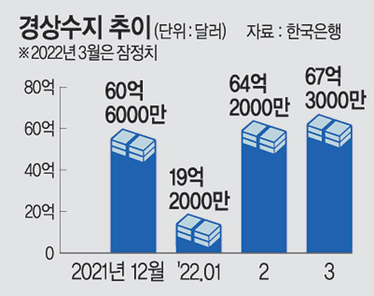 3월 경상수지는 67억3000만 달러로 23개월 연속 흑자 행진을 이어갔다. 흑자 폭은 전년 동월보다 7억7000만 달러 축소됐으나, 지난 2월과 비교했을 때 3억1000만 달러 늘어났다.