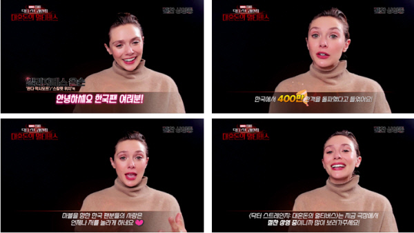 이에 엘리자베스 올슨은 “마블을 향한 한국 팬분들의 사랑은 언제나 저를 놀라게 한다”면서 “예상치 못한 스토리들과 멀티버스의 압도적인 비주얼 효과들이 가득하다”고 이 영화의 관전 포인트를 강조했다.