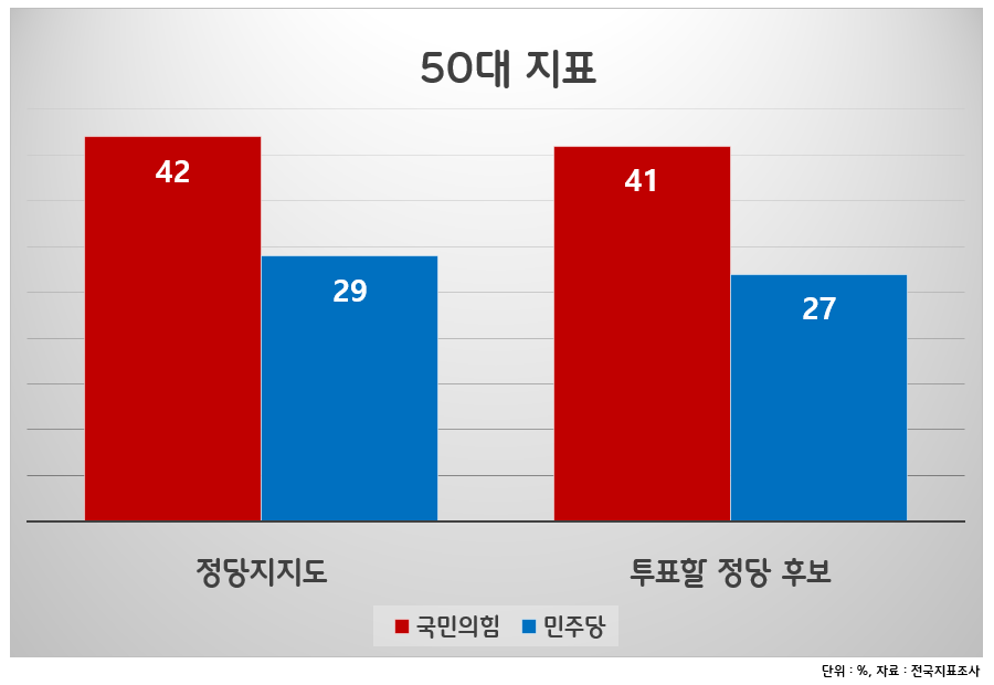 50대에서 국민의힘 지지세가 강해졌다는 점은 한국갤럽 조사에서도 확인된다. 한국갤럽 5월 3주 조사에서 50대 정당 지지도는 국민의힘 43%, 민주당 38%로 나타났다. 5월 2주에는 국민의힘 41%, 민주당 35%로 조사됐다. 대선 이틀 전인 3월 7일 진행한 조사에서는 민주당 45%, 국민의힘 38%였다. 한 여론조사 전문가는 “5월 들어 50대에서 국민의힘 지지세가 강해진 것은 확실하다”고 말했다.