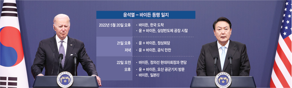 사실 바이든 대통령의 이번 방한 일정에서 최우선 관심사는 반도체였고, 경제안보 협력이었다. 그가 20일 오후 한국에 도착해 ‘에어포스 원’에서 내리자마자 첫 행선지로 세계 최대 반도체공장인 삼성전자 평택공장을 택하고 ‘가치 공유’를 언급한 데서 이는 확인된다. 정상회담 전 바이든 대통령의 이런 행보는 어떤 면에서는 ‘DMZ보다 반도체가 더 중요하다’는 점을 보여준 상징적 행위로도 읽힌다.