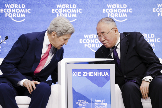 24일 스위스 다보스에서 열린 제51차 세계경제포럼(WEF) 연차총회에서 존 케리(왼쪽) 미국 기후변화특사와 셰전화 중국 기후변화특사가 기후 문제에 대한 패널 토론에서 머리를 맞대고 이야기를 나누고 있다.