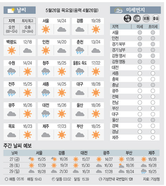 <날씨이야기>5월26일 목요일(음력 4월26일)