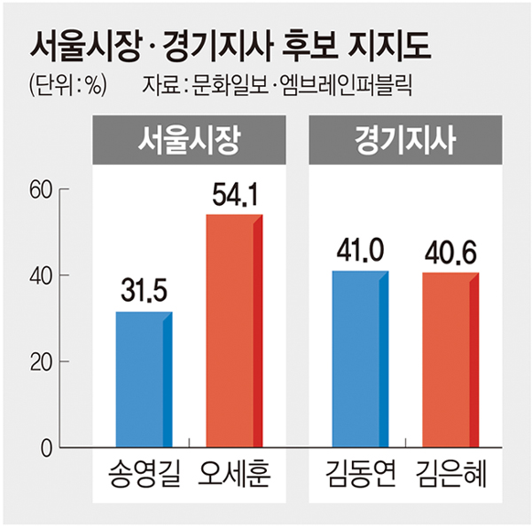 6·1 지방선거의 승부처로 꼽히는 서울시장 선거에서 국민의힘 오세훈 후보가 20%포인트 이상 앞서고, 경기에서는 김동연 더불어민주당 후보와 김은혜 국민의힘 후보가 오차범위 내에서 초접전을 벌이는 것으로 나타났다. 문화일보가 여론조사 업체 엠브레인퍼블릭에 의뢰해 지난 22~23일 서울 유권자 801명, 지난 23~24일 경기 유권자 807명을 대상으로 조사한 결과다.