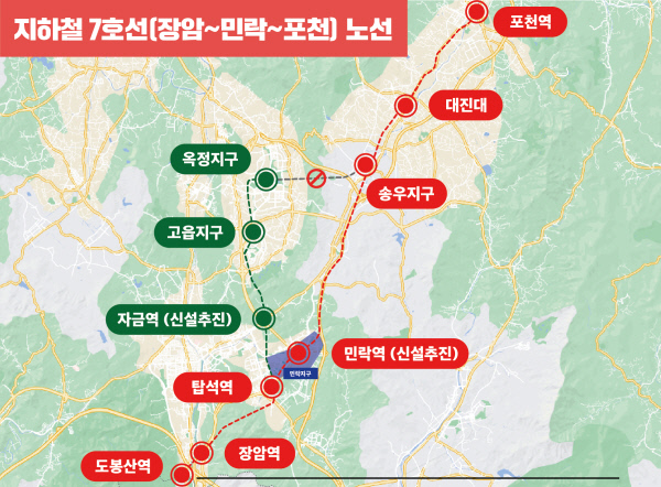 경기 의정부시가 지난 2018년 추진했다가 무산됐던 지하철 7호선 연장 노선의 민락역 신설에 청신호가 켜졌다. 6·1지방선거 의정부시장·포천시장 선거에 출마한 유력 후보들이 지하철 7호선 의정부∼포천 노선 신설을 공동 공약으로 내걸고 나섰기때문이다.