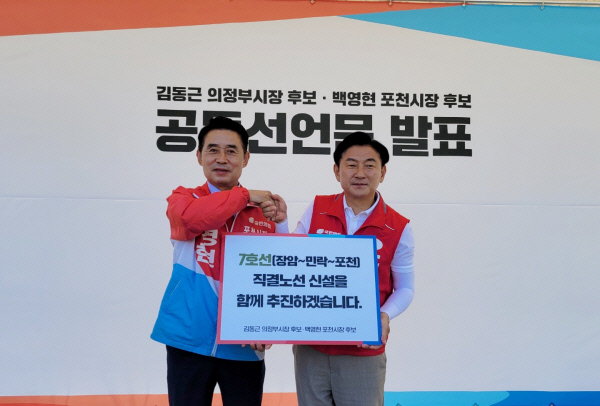 국민의힘 김동근 의정부시장 후보와 백영현 포천시장 후보는 27일 지하철 7호선 의정부∼포천 신설 노선을 추진하는 내용을 담은 공동선언문을 발표했다.