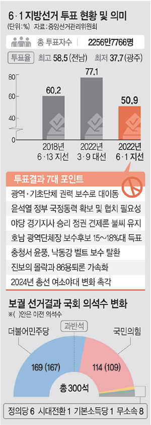 정부·여당은 2024년 4월 총선을 앞두고도 유리한 고지를 선점했다. 지방선거 결과에 따른 지방권력의 재편은 곧 지역 민심에도 영향을 미쳐 국회의원 선거와 연결된다. 현재 민주당 169석, 국민의힘 114석인 국회 의석 분포로는 입법을 통한 정책 추진이 어려운 구조다. 여권 관계자는 “최소 과반 의석을 점해야 논쟁적인 개혁과제를 처리할 수 있는 힘을 얻을 수 있다”고 말했다.