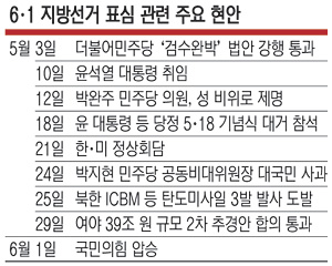 한 국민의힘 의원은 2일 문화일보와 통화에서 “지방선거 국면에 돌입한 뒤 윤 대통령의 리더십이 적극적으로 보이는 상황이 만들어진 반면, 민주당에는 악재와 내홍만 이어졌다”며 “선거 결과는 최근 한 달 정치 이슈만 따라가도 예상할 수 있다”고 말했다.