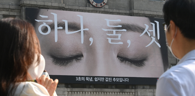 3일 오전 서울 중구 세종대로 서울광장 시청도서관 외벽에 6월 호국보훈의 달과 6·25 전쟁 발발 72년을 맞아 호국영령을 추모하고 ‘3초 묵념’에 동참하자는 메시지가 걸려 있다.