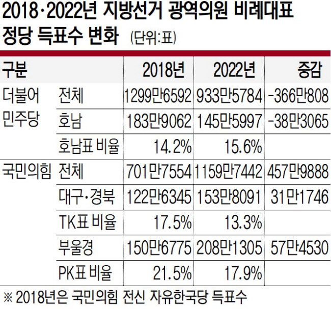 6·1 전국동시지방선거 정당별 득표수를 2018년 제7회 지방선거 당시와 비교한 결과 더불어민주당은 광주·전북·전남 등 호남 지역 득표수가 상승했지만, 국민의힘은 대구·경북(TK), 부산·울산·경남(PK) 지역 득표수 비중이 하락한 것으로 나타났다. 국민의힘이 4년 만에 전국 정당화의 길로 당세를 키운 사이 민주당은 ‘호남당’으로 위축되고 있음을 보여준다.