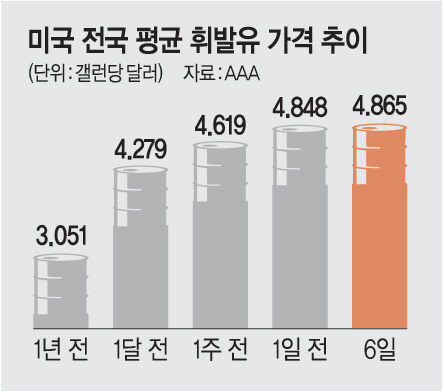 문제는 휘발유 가격이 더 오를 것으로 보인다는 점이다. 특히 에너지 컨설팅 업체 리포우오일어소시에이츠의 앤디 리포우 회장은 “다음 10일 안에 미 전국 평균 휘발유 가격이 갤런당 5.05달러를 넘어설 것”이라고 밝혔다. CNN은 “공급이 따라가지 못하는 가운데 코로나19 팬데믹(세계적 대확산)이 완화되며 더 많은 사람이 자동차를 운전하고, 항공기에 탑승하고 있어 휘발유 가격 추가 인상은 불가피해 보인다”고 설명했다.