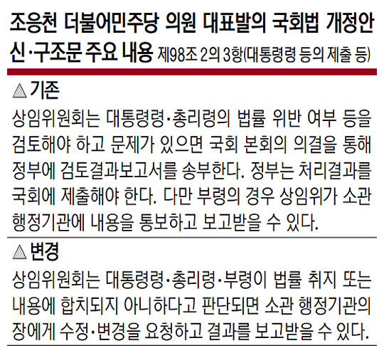 조 의원이 이날 대표발의한 국회법 개정안은 지난 7일 출범한 법무부 인사정보관리단이 법안 추진 배경이 됐다는 분석이 나온다. 민주당 한 중진의원은 “윤석열 정부가 대법관 인사 검증 등을 법무부에 맡기는 것은 삼권분립을 크게 훼손하는 것”이라며 “이러한 중대한 사안을 국회가 아닌 대통령령 등 시행령 정치로 피해 가겠다는 것에 대한 경종을 울리는 차원의 후속조치로 판단된다”고 설명했다. 조 의원은 국회법 개정안 제안 이유에 대해 “우리 헌법 제40조는 입법권은 국회에 속한다고 규정함으로써 법률 제정 권한은 국회에 있음을 분명히 하고 있다”며 “국회는 입법권을 가진 헌법기관으로서 행정입법의 내용을 통제할 의무가 있지만, 현행법에 따르면 행정입법에 문제가 있어 통보하더라도 정부가 이를 수용하지 않으면 마땅히 구속할 수단이 없다”고 지적했다.
