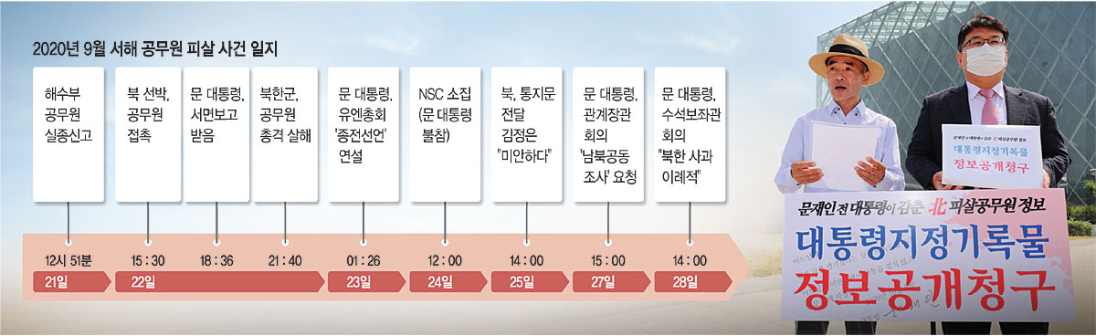 안보실의 핵심 관계자는 통화에서 “해경 자료 공개가 진실 규명을 위한 첫 단계라면, 다음 단계로는 유족 등이 헌법소원으로 대통령기록물 공개 판결을 이끌어내는 것 등을 생각해 볼 수 있다”고 말했다. 다른 관계자는 “문 정권과 김정은 정권 사이에 모종의 ‘거래’가 있었는지도 들여다볼 것”이라고 했다. 국가 존립의 원천이자 존재 이유인 국민의 생명을 지켜내지 못한 정권의 잘못을 낱낱이 밝혀내겠다는 생각이 확고하다는 뜻으로 읽힌다.
