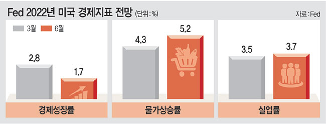 실제 Fed가 이날 새로 내놓은 올해 미국의 주요 경제 지표는 암울하다. 지난 3월 Fed가 예상했던 올해 미국 경제성장률은 2.8%였으나 Fed는 이를 1.7%로 대폭 낮췄다. 반면 물가 상승률은 3월 4.3%에서 5.2%로 높였다. 실업률도 3.5%에서 3.7%로 올려 잡았다. 스태그플레이션 가능성을 시사함과 동시에, 물가를 잡기 위해 고용악화 및 둔화를 어느 정도 감수하겠다는 의지를 드러낸 것으로 해석된다.