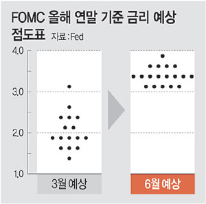 Fed의 돈줄 죄기는 올해 내내 이어질 전망이다. FOMC 위원들의 향후 기준금리전망을 보여주는 점도표에 따르면 위원 18명 중 8명이 올 연말 기준금리를 3.25∼3.5%로 전망했다. 점도표대로라면 6월 0.75%포인트에 이어 7월에도 0.75%포인트 올리고, 9월에 0.5%포인트, 11월과 12월에는 각각 0.25%포인트 올린다는 시나리오가 가능하다. 앞서 미 경제매체 CNBC도 이 같은 시나리오를 제시한 바 있다.