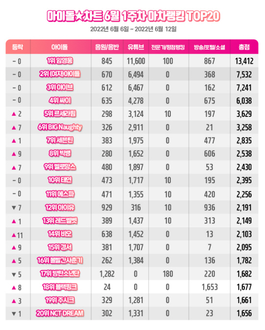 임영웅은 18일 발표된 아이돌차트 6월 1주차(22.6.6~22.6.12) 아차랭킹에서 음원점수 845점, 유튜브 점수 1만 1600점, 소셜점수 867점 등 총점 1만 3412점으로 1위를 기록했다.