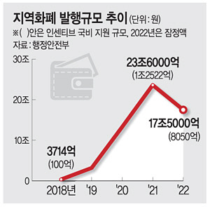 24일 행정안전부에 따르면 전국 지자체가 발행한 지역화폐 규모는 지난 2018년 3714억 원에서 2021년 23조6000억 원으로 63배로 늘었다. 문재인 정부 특유의 퍼주기 정책과 코로나19 지원 정책이 상승작용을 일으킨 탓이다. 통상 지역화폐 인센티브는 구매가의 10%를 추가하는 수준이다. 특정 지역화폐 10만 원으로 그 지역 지정 상점에서 11만 원 상당의 상품이나 서비스를 구입할 수 있다는 말이다. 이러한 지역화폐 인센티브 비용은 국비와 지방비 보전으로 구성되는데 이용률이 높아질 경우 지자체 부담이 커진다. 행안부는 2018년 100억 원(국비 전액), 2019년 884억 원(국비 보조율 40%), 2020년 6690억 원(국비 보조율 40∼80%), 2021년 1조2522억 원(국비 보조율 20∼80%)의 지역화폐 인센티브 예산을 지자체에 교부한 바 있으나 올해 본예산은 전년의 56% 수준인 7050억 원으로 예산 지원을 확 낮췄다.