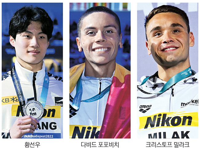 26일 막을 내린 세계선수권대회 경영 종목에서 눈길을 끄는 건 황선우를 포함한 2000년대생 남자 선수들의 활약이다. 2003년생 황선우가 자유형 200m 은메달, 2004년생 다비드 포포비치(루마니아)가 자유형 100m와 200m에서 2관왕, 2000년생 크리스토프 밀라크(헝가리)가 접영 100m와 200m를 석권했다. 특히 황선우는 자유형 200m에서 1분44초47로 한국 신기록, 포포비치는 1분43초21로 세계주니어 신기록과 루마니아 신기록, 밀라크는 접영 200m에서 1분50초34로 세계 신기록을 세웠다.