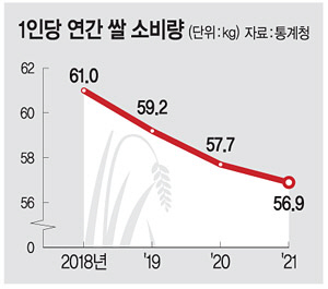 1일 전남도 등에 따르면 지난해 10월 이후 산지 쌀값이 지속적으로 하락하고 있다. 지난달 중순 산지 쌀값은 80㎏당 18만2136원으로 지난해 수확기 평균 21만4138원보다 14.9% 떨어졌다. 이는 쌀값 데이터 축적 이후 45년 만에 최대 하락 폭이라는 게 도의 설명이다. 정부가 쌀값 안정을 위해 2회에 걸쳐 2021년산 쌀 27만t을 시장 격리했지만 하락세는 멈추지 않고 있다. 시장 격리란 정부가 쌀 수급 조절을 위해 예상되는 초과 공급량을 매입을 통해 시장에서 격리하는 것을 말한다. 쌀값 하락의 원인은 간단하다. 생산량은 점점 늘고 있는데 소비량은 감소하고 있기 때문이다. 지난해 전국 쌀 생산량은 388만2000t으로 2020년 350만7000t에 비해 10.7% 증가했다. 반면 1인당 연간 쌀 소비량은 2018년 61.0㎏에서 2019년 59.2㎏, 2020년 57.7㎏, 2021년 56.9㎏으로 해마다 감소하고 있다. 통계 작성을 시작한 1963년 105.5㎏에 비하면 절반 수준이다.