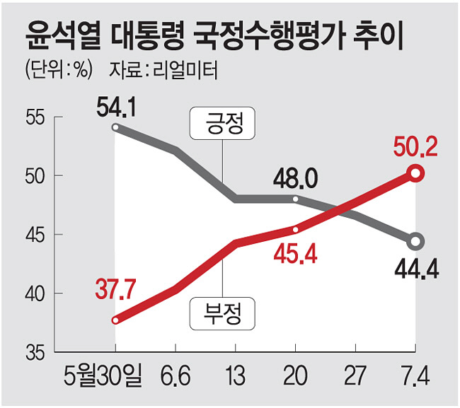 ◇2주 연속 데드 크로스 = 리얼미터가 지난달 27일부터 이달 1일까지(6월 5주차) 전국 만 18세 이상 남녀 2514명을 대상으로 조사해 4일 발표한 결과 윤 대통령이 ‘국정 수행을 잘하고 있다’는 응답은 44.4%, ‘국정 수행을 잘못하고 있다’는 응답은 50.2%로 집계됐다. 지난주(긍정 46.6%, 부정 47.7%)에 이어 2주째 부정 평가가 긍정 평가를 앞지른 조사다. 긍정 평가와 부정 평가 간 차이는 5.8%포인트로 오차범위(95% 신뢰수준에서 ±2.0%포인트) 밖이다. 같은 날 발표된 한국사회여론연구소(KSOI) 조사 역시 윤 대통령의 국정수행에 대한 긍정 평가가 42.8%, 부정 평가가 51.9%로 나타났다. 지난주에는 긍정 평가가 46.8%, 부정 평가가 47.4%였지만 이번에는 차이가 9.1%포인트로, 오차 범위(95% 신뢰수준에서 ±3.1%포인트)를 넘어섰다. 박성민 정치컨설팅 민 대표는 “정권이 교체됐음에도 전 정부와의 차이를 보여주거나 전 정부보다 낫다는 걸 보여주지 못했다”며 “중도층 이탈이 심하다”고 강조했다.